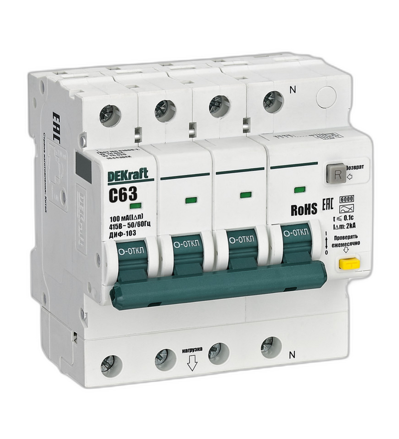 Автоматический выключатель с дифференциальной защитой DEKraft АВДТ 3P+N 63А 100мА тип А, х-ка C, модель ДИФ-103 6кА, артикул 16443DEK — это современное электроустройство, предназначенное для комплексной защиты электрических сетей от коротких замыканий, перегрузок и токовых утечек. Благодаря чувствительности 100 мА и типу тока А, данный АВДТ способен обнаруживать утечки как переменного, так и пульсирующего характера, обеспечивая максимальную безопасность и надежность работы электросистемы.