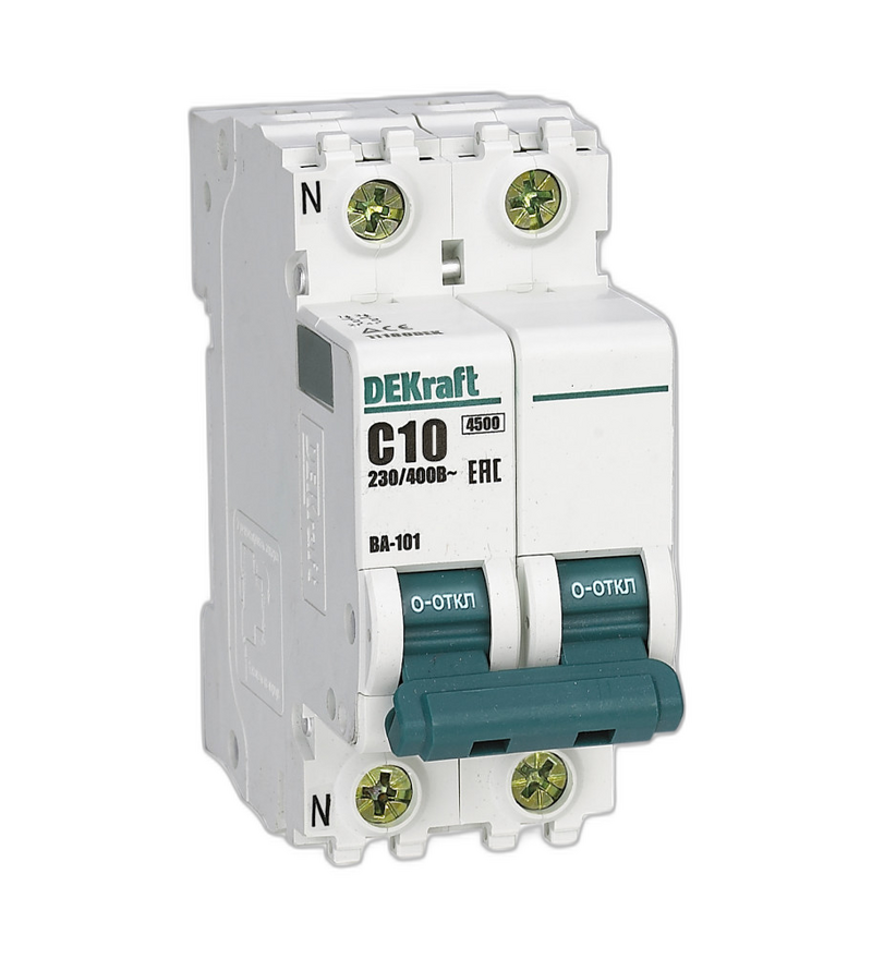 Автоматический выключатель ВА-101 1P+N 10А C 4.5кА, Dekraft — надёжное устройство для защиты электропроводки и оборудования от перегрузок и коротких замыканий. Располагает полюсами 1P+N (фаза + нейтраль), что обеспечивает эффективное отключение в однофазных сетях 220–230 В переменного тока.