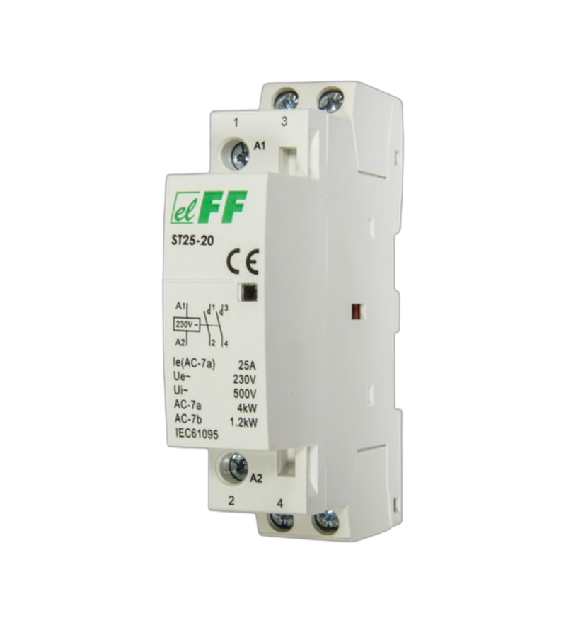 Контактор ST-25-20 имеет компактный модульный корпус, который обеспечивает удобный монтаж на стандартную DIN-рейку в электрощите. Его конструкция гарантирует высокую надёжность работы и безопасность эксплуатации при соблюдении правил монтажа.