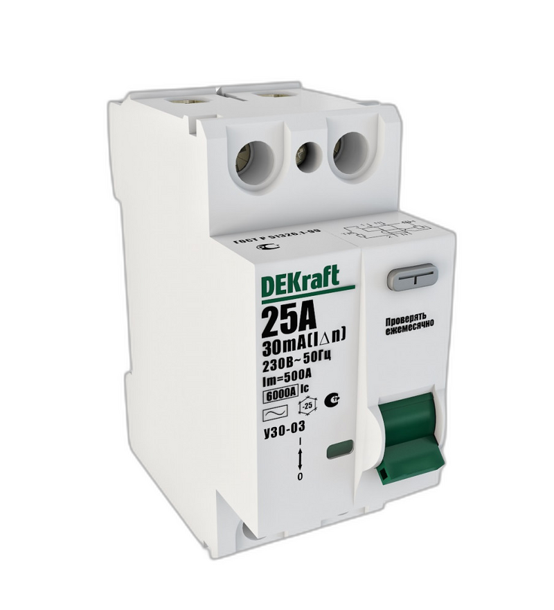 Купить УЗО Dekraft ВДТ 2P 25A 10мА тип AC УЗО-03 6кА с артикулом 14051DEK можно в Минске с доставкой по всей Беларуси. Оригинальный товар всегда в наличии в ТЦ Ленинград.