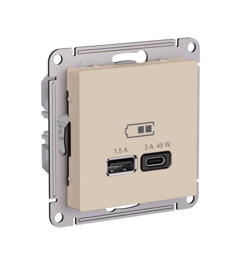 ATLASDESIGN USB розетка A + тип-C 45W высокоскоростная зарядка QC, PD, механизм, бежевый — современное устройство для удобного и быстрого заряда ваших мобильных гаджетов прямо из розетки. Благодаря встроенным портам USB-A и USB-C с поддержкой протоколов Quick Charge (QC) и Power Delivery (PD), вы сможете заряжать смартфоны, планшеты, ноутбуки и другие устройства с максимальной скоростью до 45 Вт.