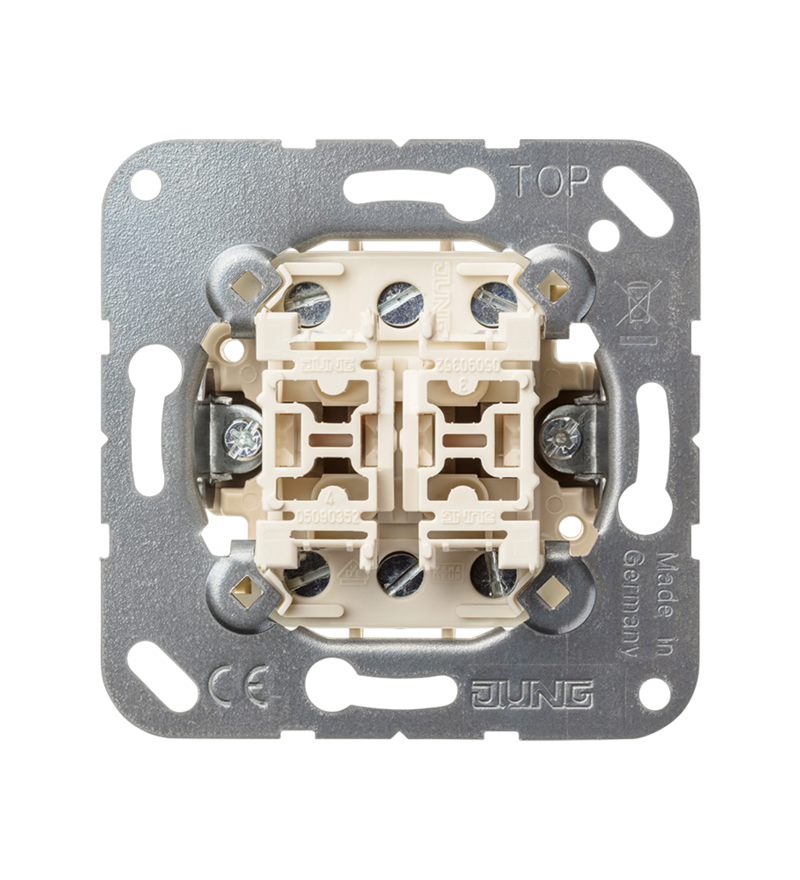 Двухклавишный механизм JUNG без фиксации — отличный выбор для помещений, где требуется мгновенный контроль подачи тока без фиксации состояния, например, для звонковых систем или временного управления освещением. Надёжность контактов и качественные материалы обеспечивают долговечность и безопасность эксплуатации.