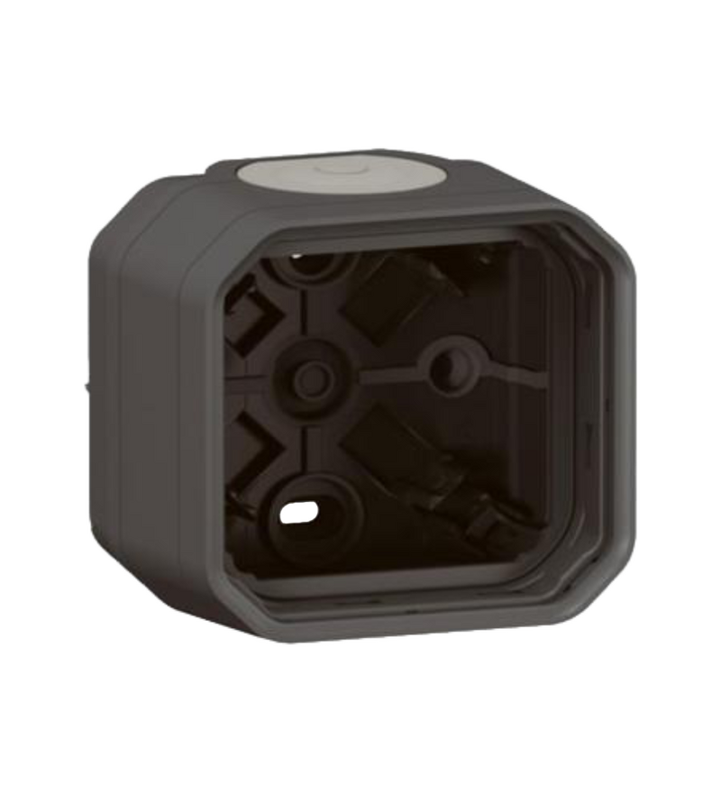 PLEXO - Коробка для накладного монтажа 1 пост (антрацит), артикул 069601L — это корпус для установки одного модуля накладным способом, идеально подходящий для помещений с повышенной влажностью и трудными условиями эксплуатации. Коробка выполнена в стильном цвете антрацит, что придаёт ей современный и универсальный вид.