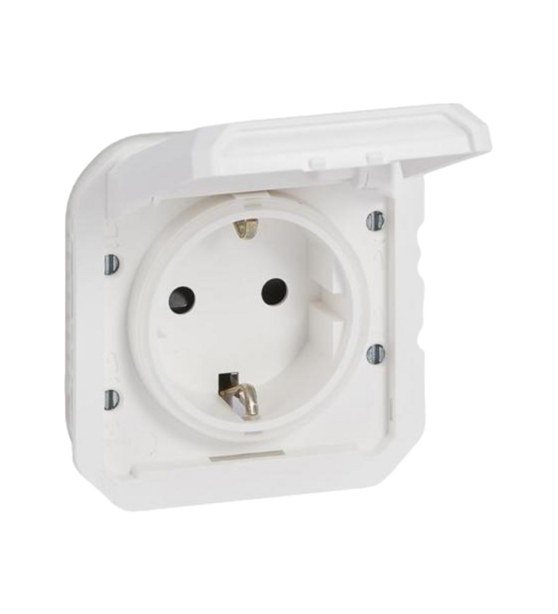 PLEXO - Розетка 2P+E немецкого стандарта с защитным контактом, IP55, белая — надежное и функциональное решение от Legrand для установки в помещениях с повышенной влажностью и пылезащитой. Эта розетка предназначена для подключения электроприборов с евро-вилкой типа F, обеспечивая безопасность и устойчивость к воздействию внешних факторов благодаря высокому классу защиты IP55.