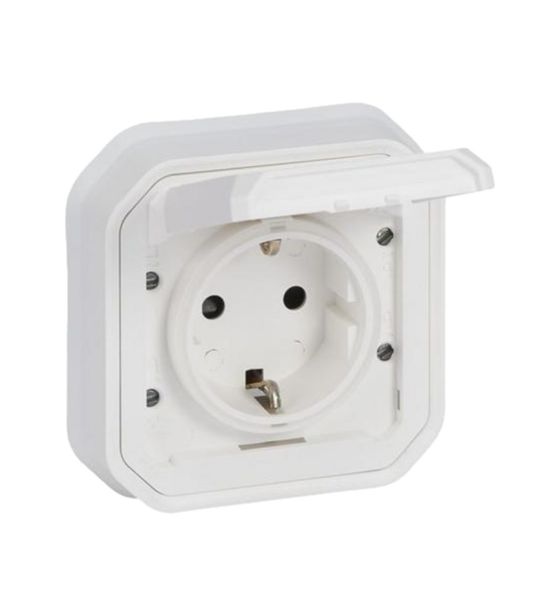 PLEXO - Розетка 2P+E нем. стд. IP55 с рамкой (белый), NEW — влагозащищённая розетка от известного производителя Legrand, предназначенная для надёжного электроподключения в условиях повышенной влажности и загрязнений. Она оснащена немецким стандартом заземления Schuko (2P+E), что обеспечивает безопасное использование бытовой техники и электрооборудования.
