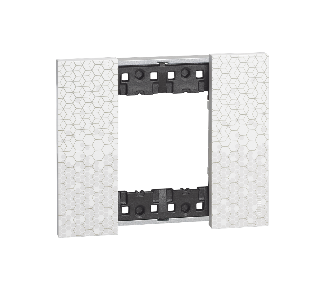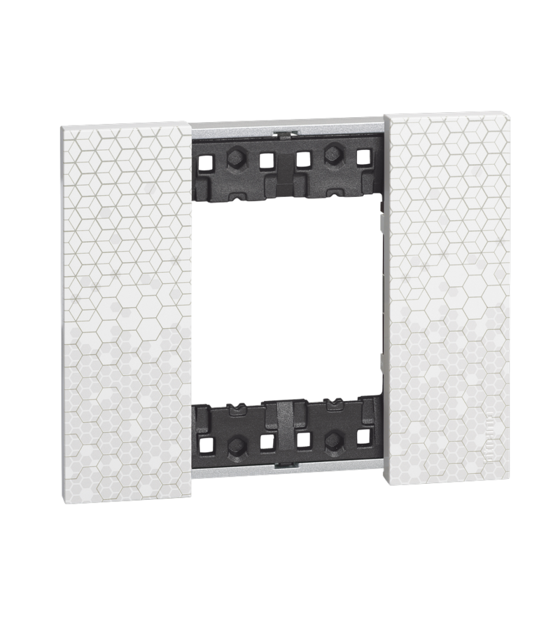 Рамка 2 поста Bticino Living Now «Пиксель» выполнена из прочного пластика с белым матовым покрытием и характерным гексагональным узором. Геометрическая текстура придаёт оформлению выразительность, оставаясь при этом нейтральной и универсальной в сочетании с белыми, чёрными и графитовыми механизмами серии.