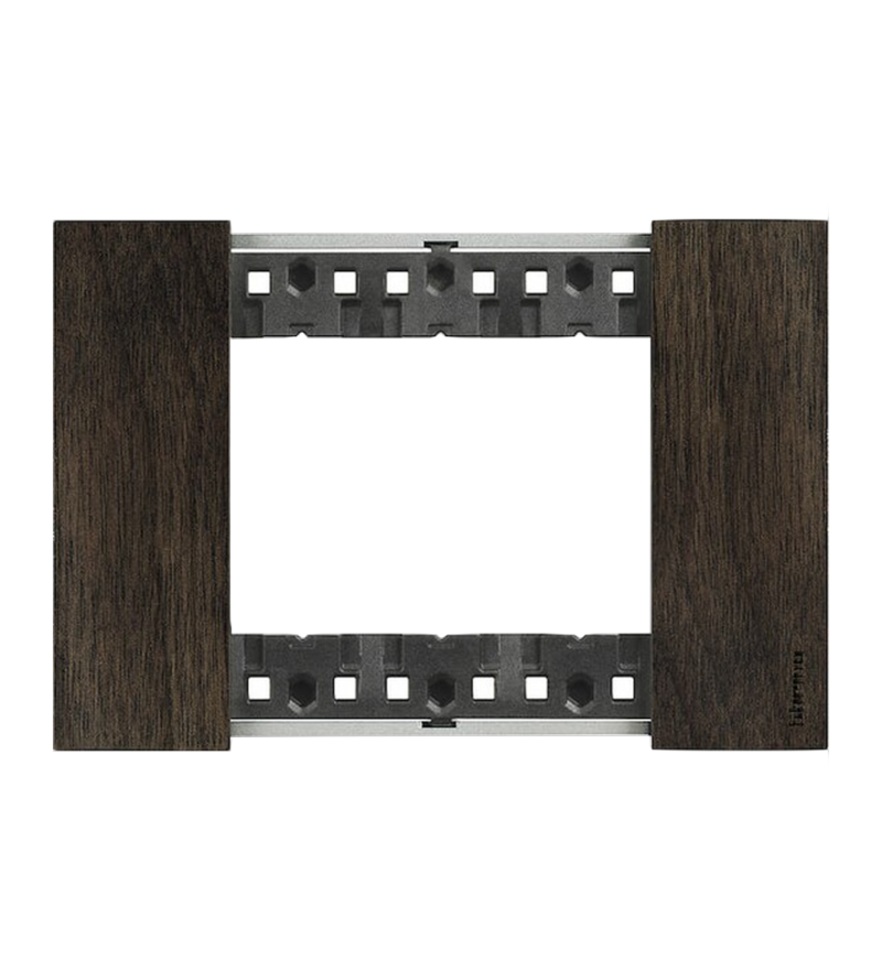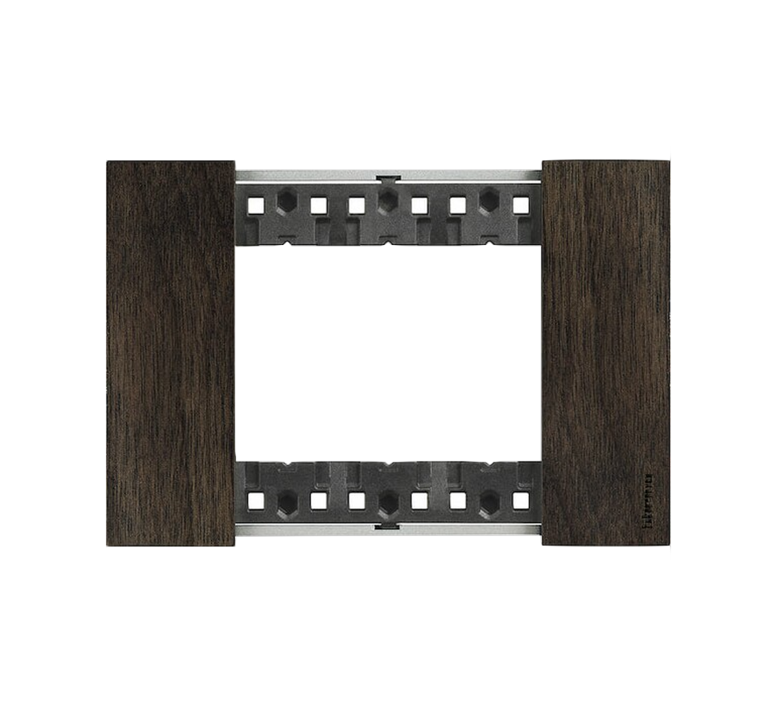 Рамка Bticino Living Now 3 модуля с отделкой под тёмный орех — выбор для интерьеров с насыщенной палитрой и акцентом на натуральные материалы. Шпон с матовой обработкой подчеркивает рисунок древесины и создаёт ощущение тактильной глубины.