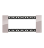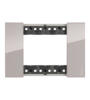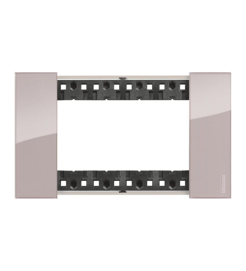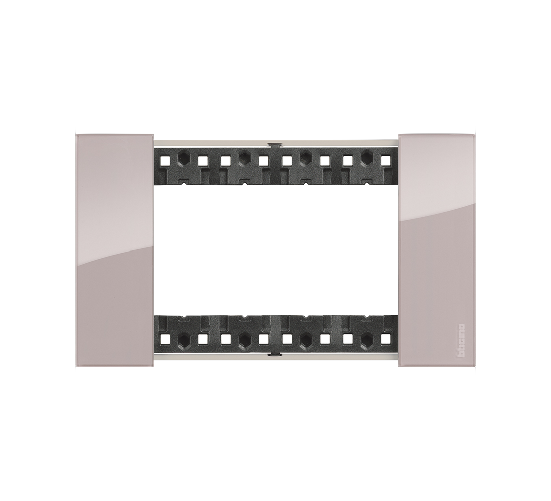 Рамка 4 модуля Bticino Living Now в цвете «Аура» — элегантный акцент с глянцевой серой поверхностью. Оттенок варьируется между светло-графитовым и пепельно-розовым в зависимости от освещения, добавляя интерьеру мягкую глубину.