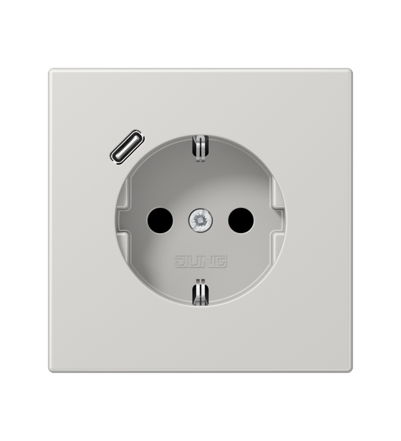 Розетка SCHUKO® с USB-зарядным устройством, тип С, светло-серая, термопласт от JUNG — это современное и функциональное решение для электропитания и зарядки цифровых устройств в жилых и офисных помещениях. Благодаря интеграции стандартной розетки SCHUKO® и USB-порта тип C, устройство обеспечивает удобство подключения как классических электроприборов, так и гаджетов без дополнительных адаптеров.