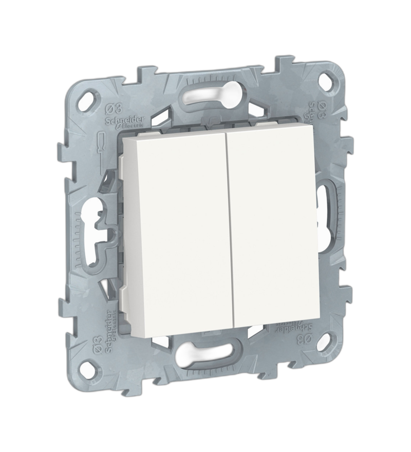 Белый переключатель Schneider Unica New 2-клавишный, выполнен по двойной схеме 6, что позволяет управлять двумя независимыми группами освещения из двух разных точек. Это оптимальное решение для спальни с двумя входами, длинного коридора, лестничных пролётов или любых помещений, где важно включить и выключить свет с обеих сторон.