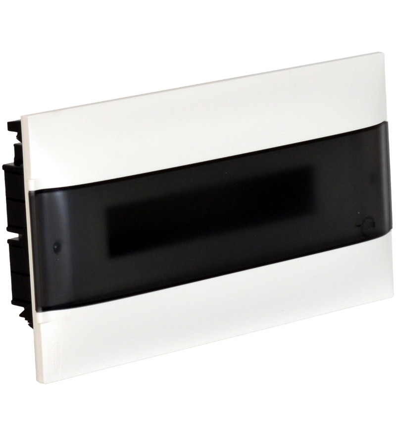 Корпус щитка рассчитан на встроенный монтаж в полые стены, что позволяет сохранить эстетичный внешний вид интерьера. Прозрачная дымчатая дверь из ударопрочного пластика защищает внутренние компоненты от пыли и механических повреждений, сохраняя при этом обзор внутреннего пространства щитка без необходимости открывать дверцу.