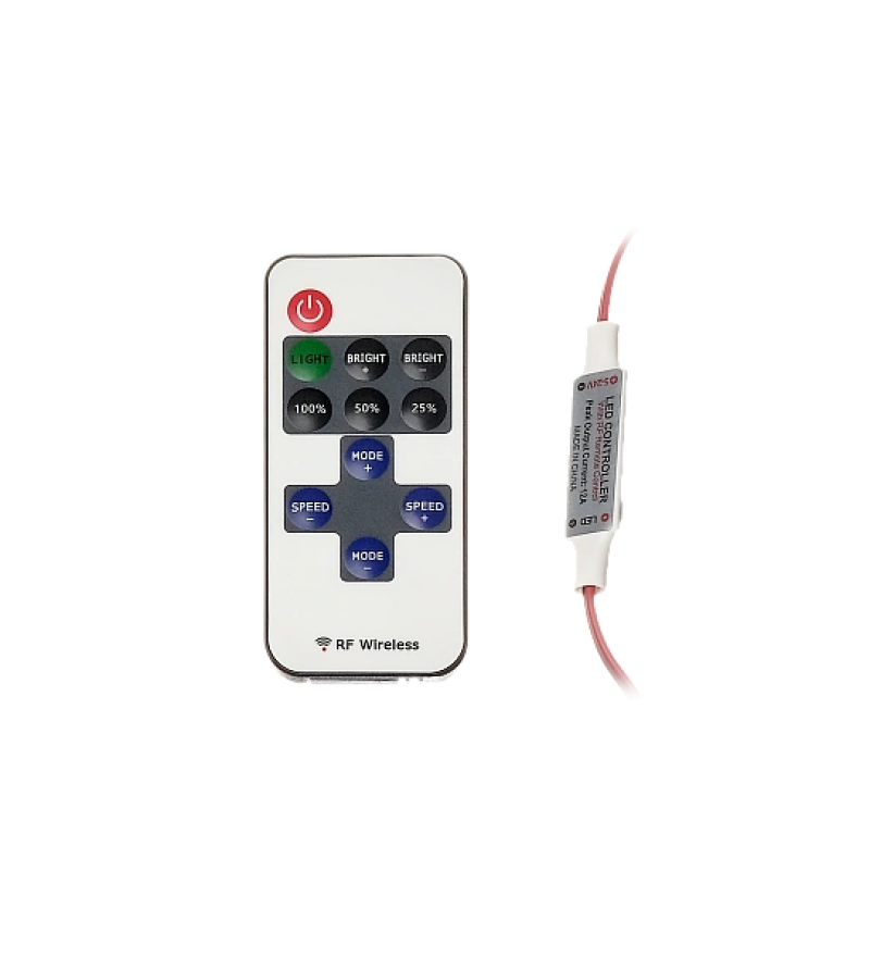 Управление осуществляется с помощью радиочастотного (RF) пульта дистанционного управления с 11 кнопками, что обеспечивает удобство и функциональность без необходимости прямой видимости устройства. Контроллер рассчитан на одно канал (1CH), максимальный выходной ток - 6 А, что позволяет работать с нагрузкой до 72 Вт при 12 В и до 144 Вт при 24 В.
