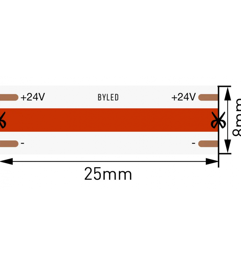 Светодиодная лента Byled Standart COB CSP Led, 480 LED/m, 11W/m, 12V, IP20, Цвет: Красный — это высококачественное освещение на основе современных технологий COB (Chip on Board) и CSP (Chip Scale Package). Эта светодиодная лента объединяет 480 мощных LED-элементов на метр длины, обеспечивая яркое и равномерное красное свечение с минимальным количеством теней и бликов.