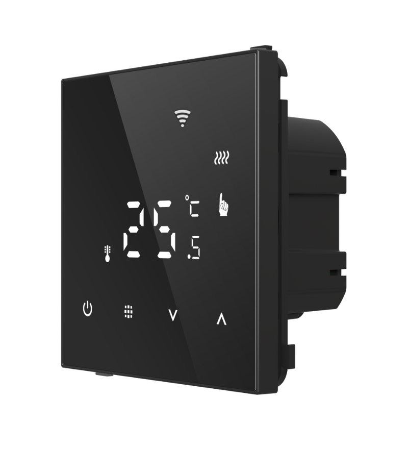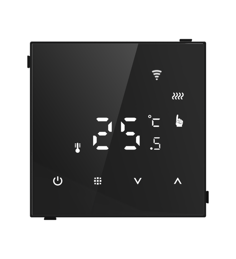 Корпус термостата выполнен из высококачественного материала с необычным покрытием из черного стекла, что придаёт устройству современный и стильный вид, легко вписывающийся в интерьер любого помещения. Размеры 70х70 мм позволяют устанавливать термостат в стандартные подрозетники скрытого монтажа, обеспечивая аккуратный и незаметный монтаж.